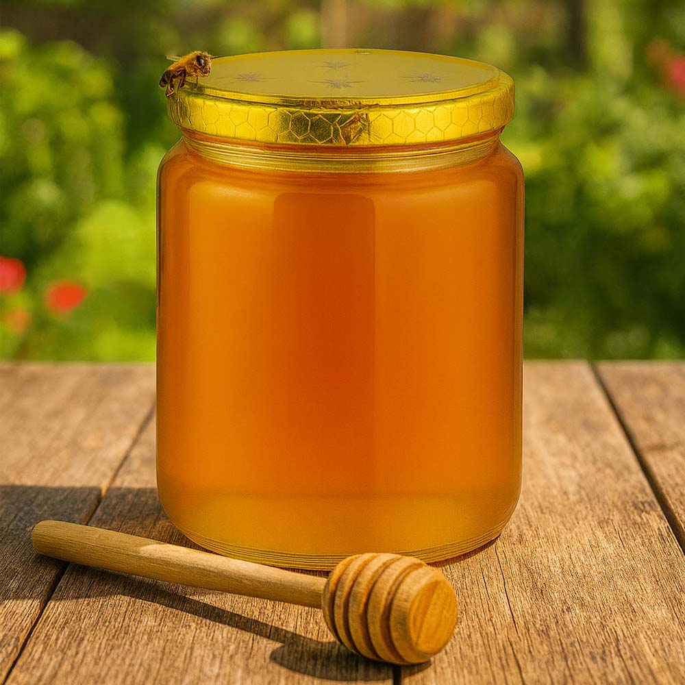 Vasetto in vetro per miele da 1000 g con capsula metallica decorata con motivo a favo BasicSeal UNiTWIST. Una soluzione perfetta per grandi quantità, confezioni regalo e presentazioni eleganti.