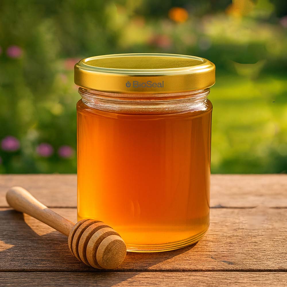 Vasetto in vetro per miele da 200 g con capsula metallica dorata BioSeal UNiTWIST. Perfetto per regali, vendita premium e piccole porzioni di miele.