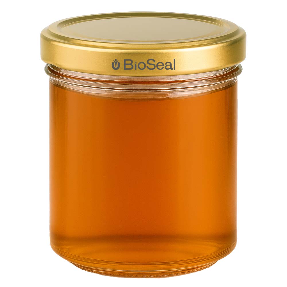 Vasetto per miele da 200 g con capsula dorata BioSeal UNiTWIST