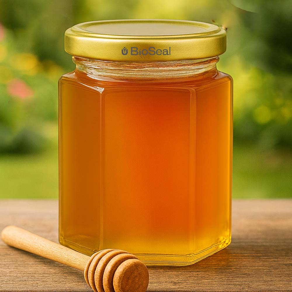 Vasetto in vetro per miele da 250 g con capsula metallica dorata BioSeal UNiTWIST. Perfetto per confezioni premium, vendita diretta e presentazioni eleganti.