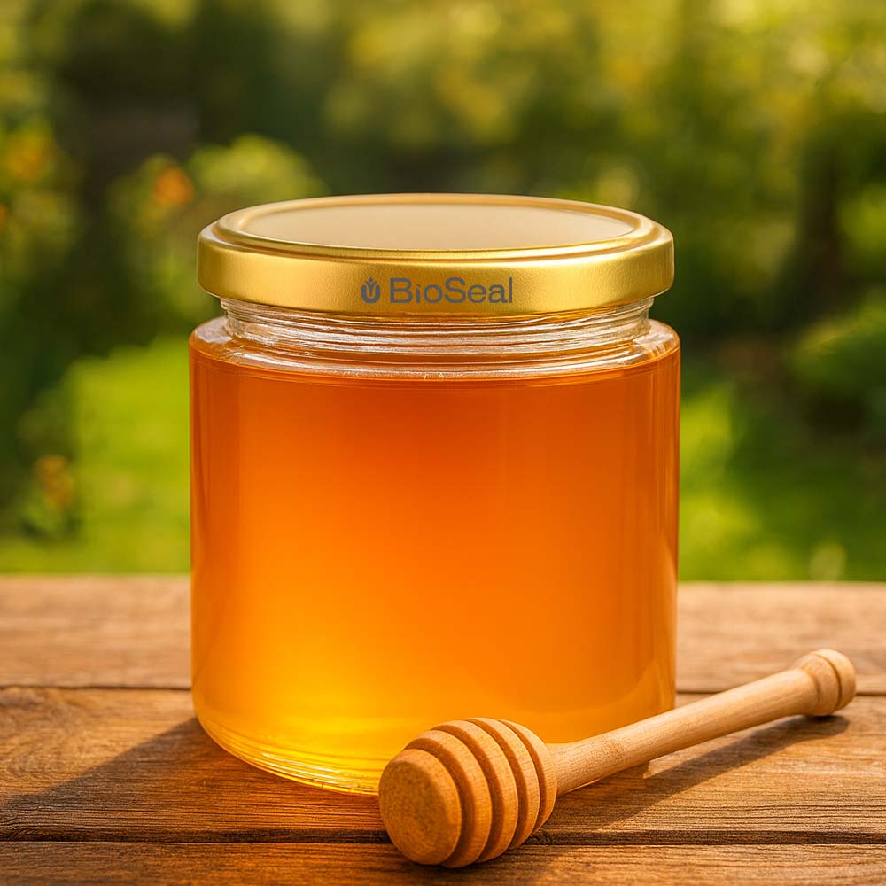 Vasetto in vetro per miele da 350 g con capsula metallica dorata BioSeal UNiTWIST. Perfetto per confezioni regalo, presentazioni eleganti e vendita premium.