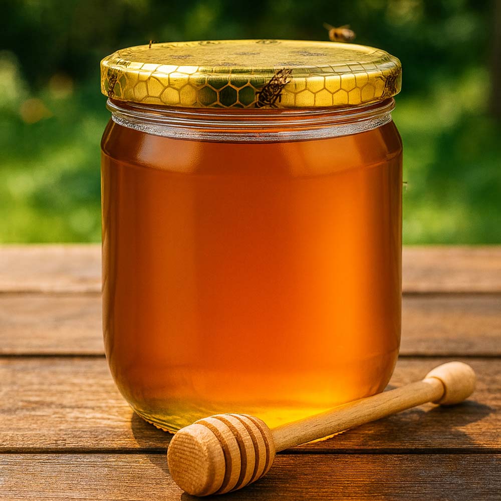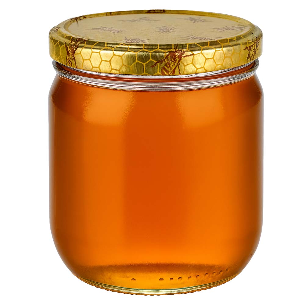 Vasetto in vetro per miele da 500 g con capsula metallica decorata con motivo a favo BasicSeal UNiTWIST. Il design a nido d’ape valorizza l’origine naturale del miele e si presta perfettamente a confezioni regalo e presentazioni professionali.