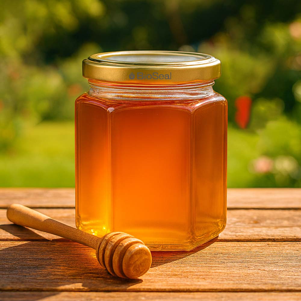 Vasetto in vetro per miele da 520 g con capsula metallica dorata BioSeal UNiTWIST. Perfetto per confezioni eleganti, vendita diretta e grandi porzioni.