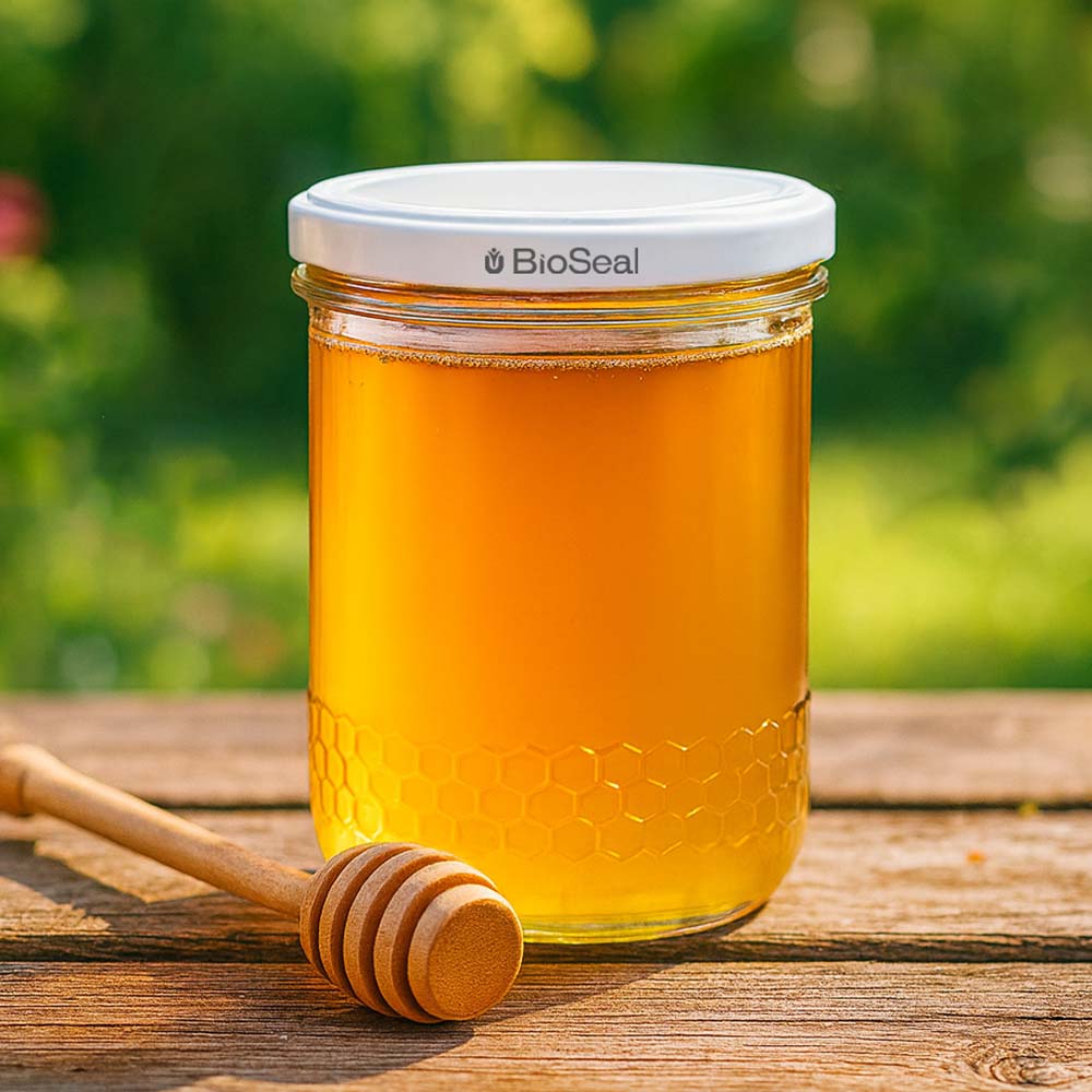 Vasetto per miele da 560 g con capsula bianca BioSeal UNiTWIST